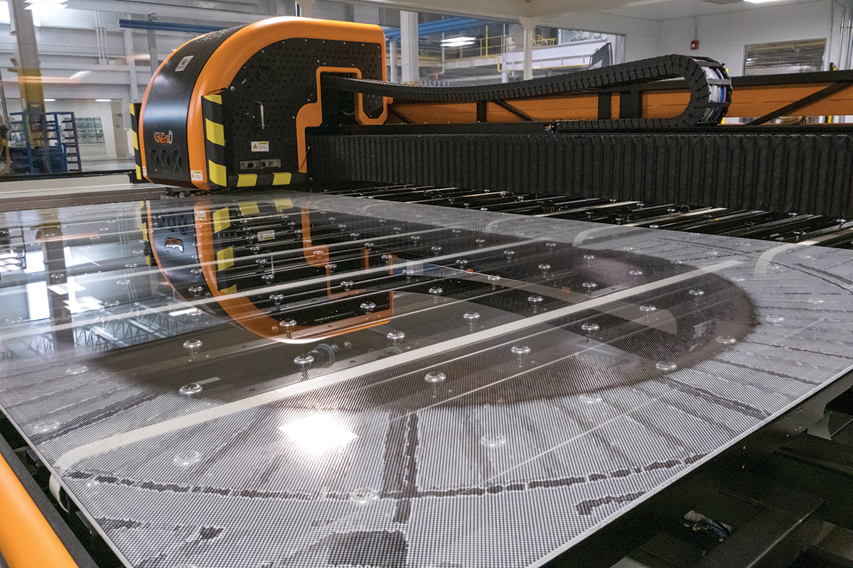 Above: Ceramic frit digital printed glass at AGNORA’s glass fabrication facility.
